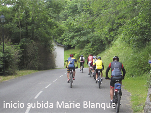 ![]() Amaneció un día nublado y fresquito pero sin amenaza de lluvia inicial. Así que una vez preparadas las "cabalgaduras" iniciamos la etapa siguiendo el valle de Aspe aguas abajo hasta Escot. Aquí comienza la subida por su vertiente occidental al mítico "Marie Blanque" (la Dama Blanca de los Pirineos). El puerto nos recibe "amablemente", los 6 primeros kms nos permiten ir cogiendo el ritmo para afrontar el duro tramo final. La pendiente va aumentando progresivamente desde un 2% hasta el 7% de promedio en cada tramo kilométrico, al tiempo que el arroyo Barescou nos refresca la subida con sus limpias aguas a nuestra derecha. Sin embargo, los 4 kms finales de la subida ya son "palabras mayores". A la altura del camping del Molino de Barescou la pendiente media sube al 11% con algún pico del 15 % y con un trazado casi rectilíneo que lo hace más duro de llevar. Los 3 km finales se hacen larguísimos con promedios que alcanzan el 13 % y solo al coronar se suaviza un poco.