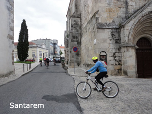 La ciudad monumental del Ribatejo se nos muestra en lo alto de un otero. Pasamos por debajo de la autopista, nos acercamos al aeródromo de Santarem, cruzamos bajo la vía férrea y a continuación iniciamos la fuerte subida de acceso al núcleo urbano. Santarem es una de las localidades históricas de Portugal: castillo, murallas y sus numerosas iglesias dan fe de su rica trayectoria. Situada en lo alto de un cerro y bañada por el Tajo, es un crisol de culturas, pues dio abrigo a romanos, moros, fue sede templaria y hoy acoge a los peregrinos que se dirigen a Santiago de Compostela. Además de rendir visita turística a la ciudad, aprovechamos para para hidratarnos con el rubio elemento acompañado por unos bocatitos disfrutando de las panoramicas en le recinto amurallado Portas do Sol.